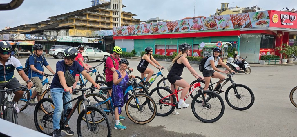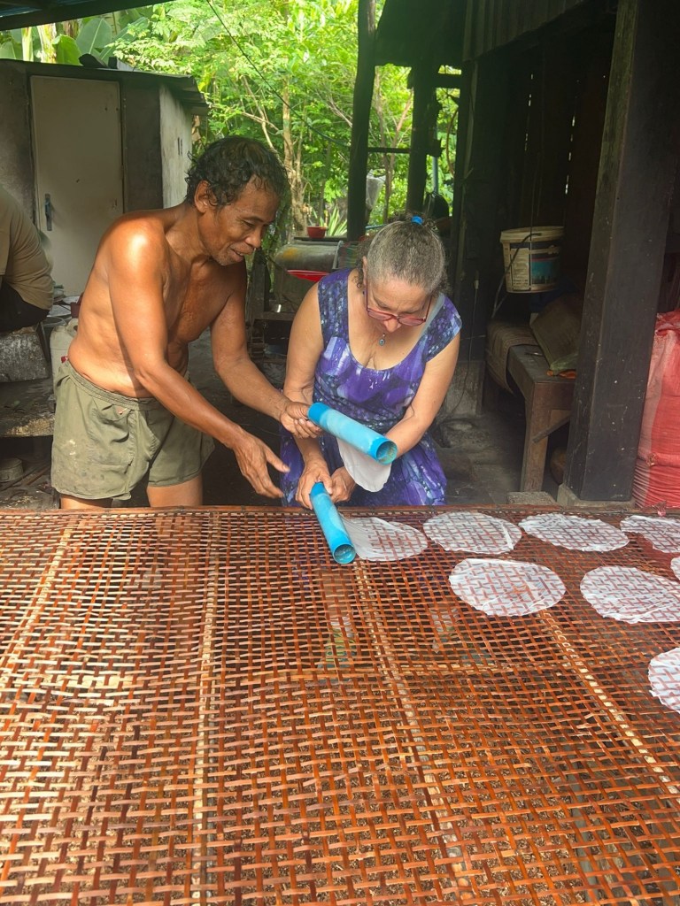 When I was in my 20’s I went on a bike trip through the UK with my friend Nancy. Back in the day, we thought it was hilarious that the Britts used the expression “on your bike!” to mean “get going!”. To my delight, it was not raining this morning when we got going through the Cambodian countryside on rented bikes. We visited local families who fed us tropical fruit and demonstrated the making of rice paper, rice wine and bamboo sticky rice. Except for being drenched in sweat due to the humidity, and the fact that my bike was too small, it was a welcome break from buses, planes and tuk tuks.