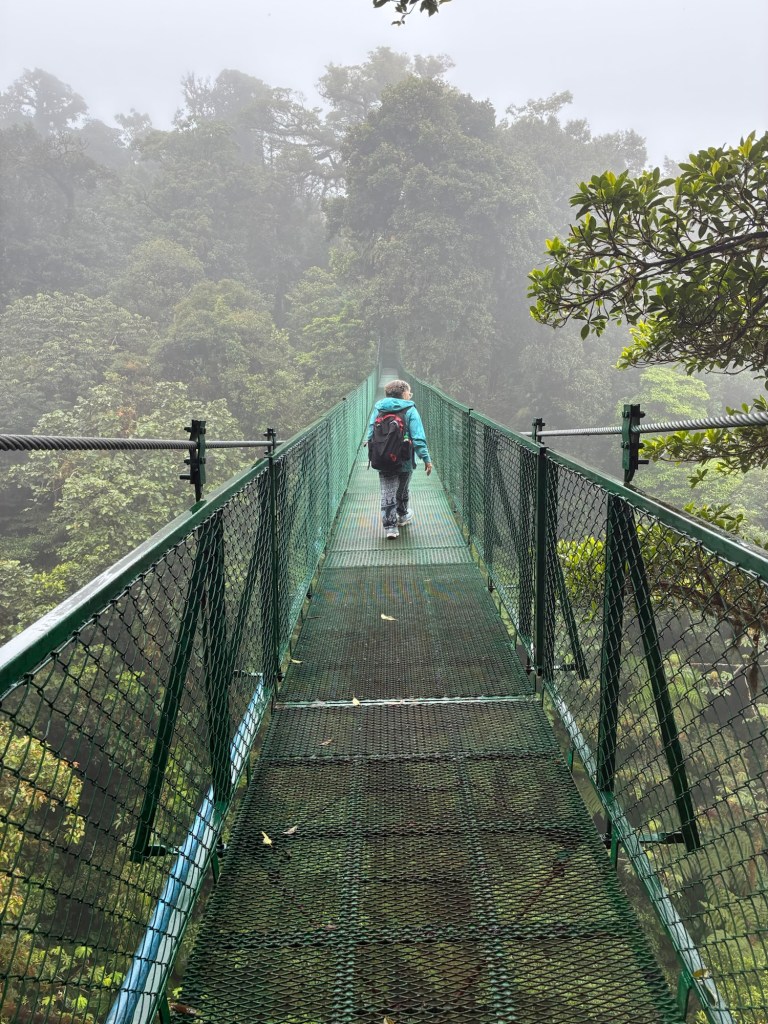 We saw lovely waterfalls, an ancient indigenous stone, iguanas and tropical butterflies in Tilaran. Toured a family owned coffee farm,where the owners knew an abundance about birds and local fauna and dedicate themselves to growing plants that support their habitats. Drove some intrepid roads to Monteverde, where we crossed hanging bridges in rain that reminded me of Oregon, and also visited a sloth refuge, a butterfly sanctuary and a reptile exhibit. Oh, the critters you’ll see!